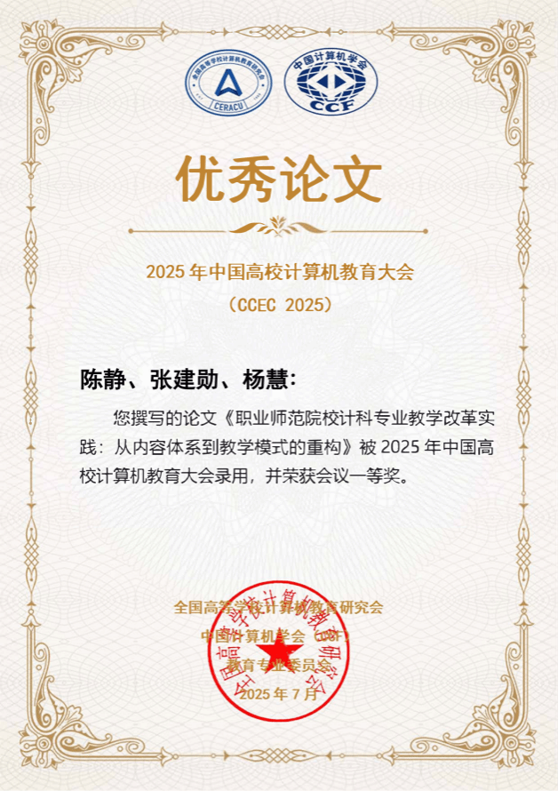 近日, 2025年中国高校计算机教育大会(CCEC 2025)在银川成功举办。本次大会上,公司张建勋和陈静分别撰写的两篇论文荣获2025年中国高校计算机教育大会(CCEC2025)论文一等奖,彰显了公司在计算机教育领域的教学研究实力与创新成果。张建勋团队撰写的《基于一致性建构的研究生课程思政教学研究与实践》聚焦研究生课程思政建设,探索教学融合新路径,被推荐至《计算机技术与教育学报》发表;陈静团队撰写的《职业师范院校计科专业教学改革实践:...